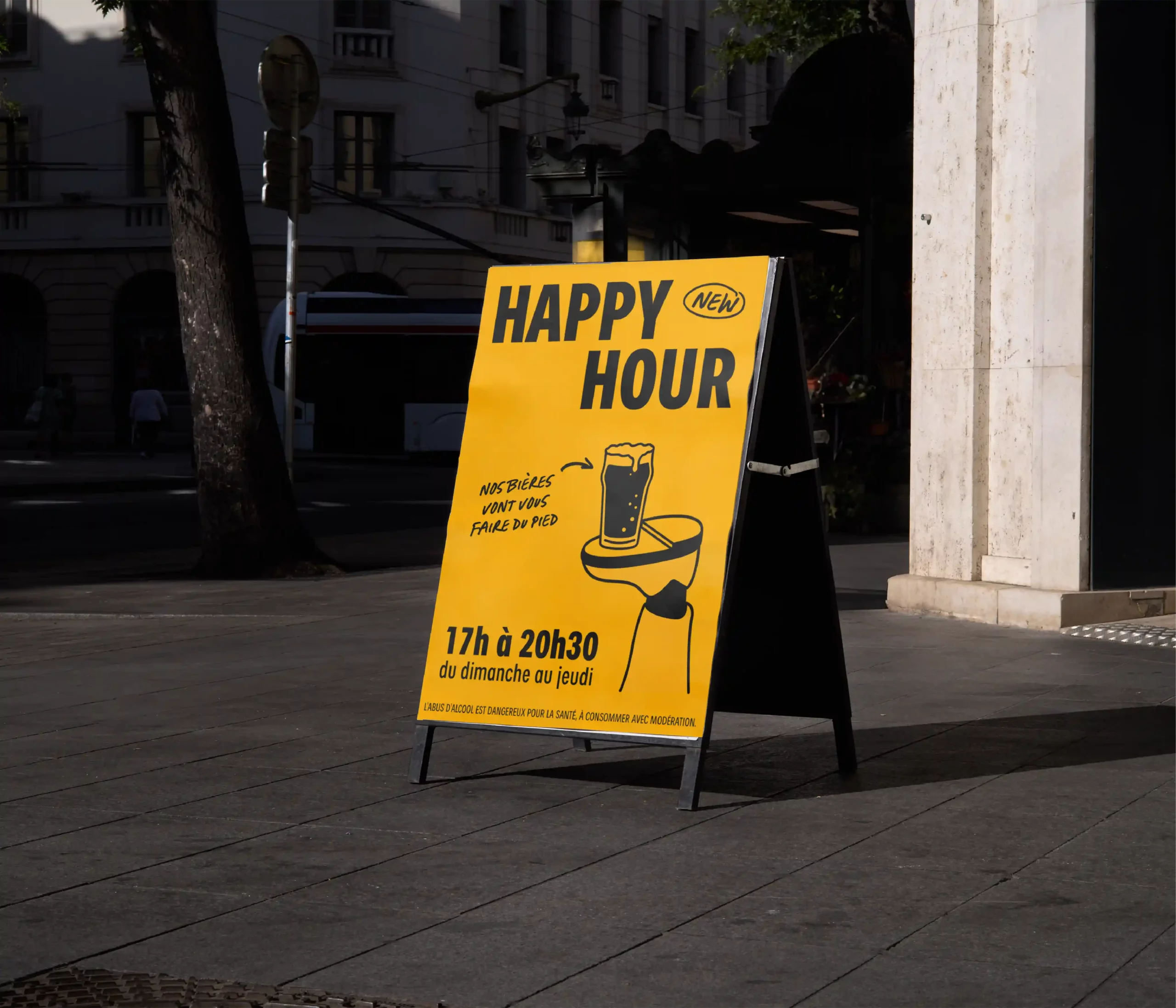 L’ensemble forme un système graphique simple, qui s’applique facilement sur les affiches, les menus et les réseaux sociaux. L’accumulation des visuels et des messages permet de créer quelque chose de vivant, en lien direct avec l’ambiance du bar.